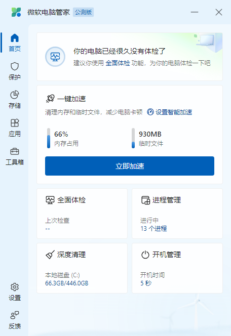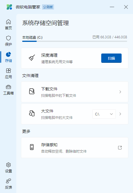 微软电脑管家可以做到快速检查Windows系统硬盘中的缓存文件和不常用软件,做到全面检测,不放过任何一个硬盘位置,对于系统的异常,可以快速响应并智能优化。
