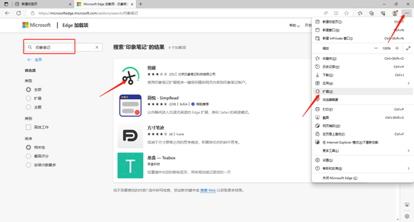 1、首先打开浏览器,我们以IE为例,点击右上角【设置及其他】-【扩展】,在搜索栏中输入【印象笔记】。
