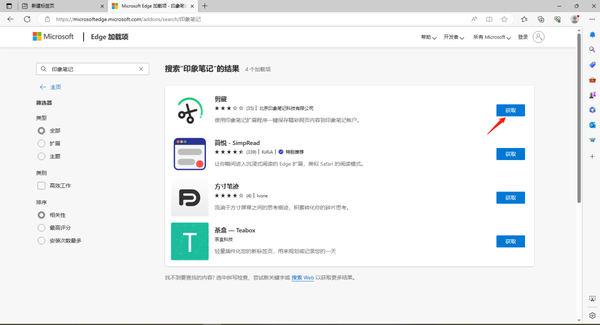 2、第一个【剪藏】就是我们需要安装的插件啦,点击后面的【获取】,安装好后我们需要登录自己的印象笔记账号。