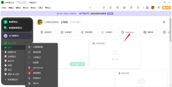 1、打开印象笔记,点击【首页】后可以在看到【Markdown】入口;或者点击【更多新建】也可以进到到【Markdown】中。