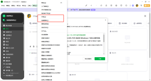 点击菜单栏中的【帮助】功能,选择【升级】或者【检查更新】将印象笔记更新升级至最新版本。