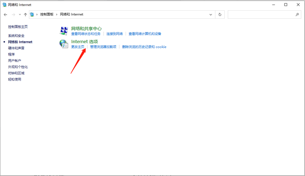 2、在网络和internet窗口中找到【Internet选项】并单击。