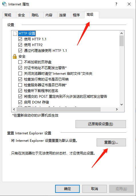 3、在Internet属性窗口中,选择上方【高级】按钮并点击。在高级页面中选择下方【重置】选项。