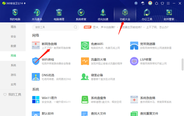 360安全卫士提供了360断网急救箱功能,360断网急救箱能够对电脑进行全面的诊断,检查电脑网线、驱动、网卡、DHCP服务是否正常。360断网急救箱独立版体积小巧,使用简单,一键即可修复断网异常情况,帮助用户正常上网。打开360安全卫士,在上方选择【功能大全】,进入到功能列表界面后,在左侧点击【网络】,然后在右侧的功能列表中选择【断网急救箱】。点击右上方的【全面诊断】,扫描出来问题后我们依次点击修复就可以了。