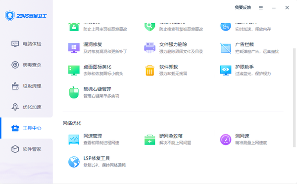 2345安全卫士中也是有断网急救箱的功能,打开2345安全卫士之后我们在左侧下方点击【工具中心】,接着在右侧列表中找到【断网急救箱】并点击。在之后出现的页面中点击【全面诊断】,待诊断结果出来后,根据问题进行修复就可以了。