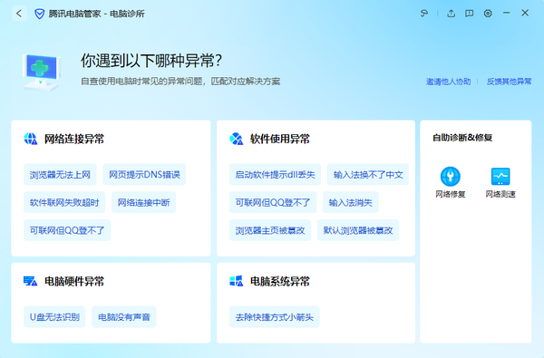 腾讯电脑自带网络修复工具,检测修复常见断网问题。打开腾讯电脑管家之后在左侧下方点击【电脑诊断】,然后点击【网络修复】即可,可以全面诊断网络问题。