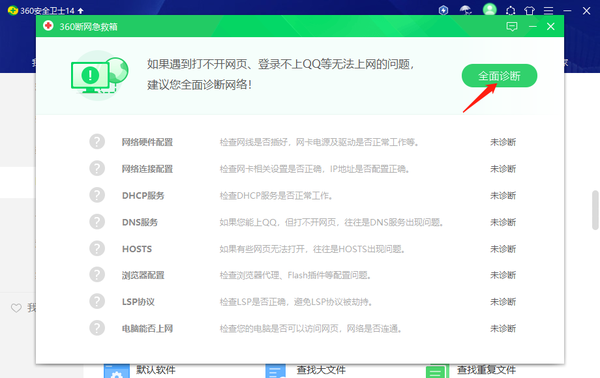 2、在打开的断网急救箱页面中,点击【全面诊断】。