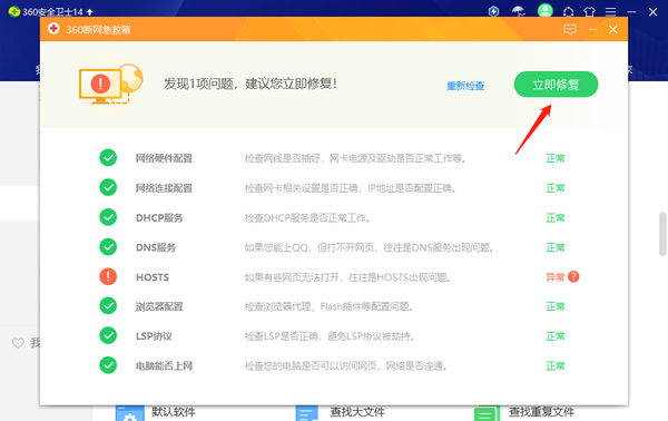 3、软件将自动检测系统中可能存在的断网故障,并给出修复建议。软件扫描结束之后,点击【立即修复】,软件将自动修复系统中存在的断网故障。