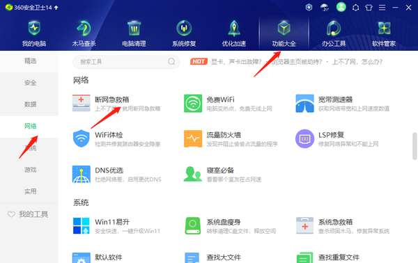 1、打开360安全卫士,在主页上方选择【功能大全】,进入到功能列表界面后,在左侧点击【网络】,然后在右侧的功能列表中选择【断网急救箱】。