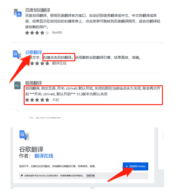 4、可以看到,搜索结果中,为我们展示了【百度划词翻译】、【谷歌翻译】、【极简翻译】等等工具,可以帮助我们实时翻译、划词翻译、英汉互译等等,而且每一种翻译工具的打开方式都有详细说明,大家可以根据自身喜好下载添加。