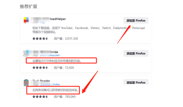 2、或者点击左侧的【推荐】、【主题】、【插件】等,都可以查找自己想要的选项,并且火狐浏览器还为我们提供了每一个功能选项的用户使用量,以及标注了每个选项的主要用处,来引导大家合理选择。