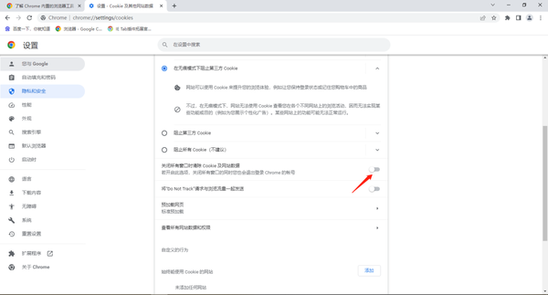 4、进入该页面后,在【常规页面】下,将【关闭所有窗口时清除Cookie和网站数据】选项关闭。