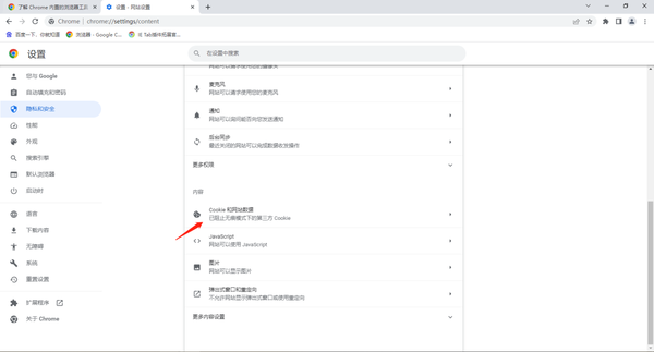 3、进入网站设置界面后,点击【Cookie和网站数据】。
