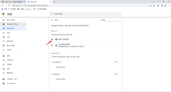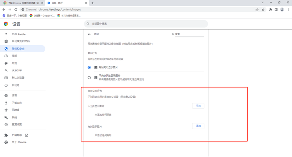3、当然也可以在下方【自定义行为】处对【允许显示图片】的网站以及【不允许显示图片】的网站进行指定设置。