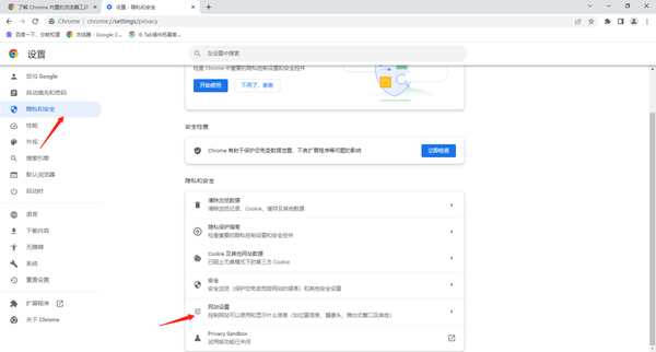 2、进入设置界面后再左侧选择【隐私设置和安全性】,然后在右侧点击【网站设置】。