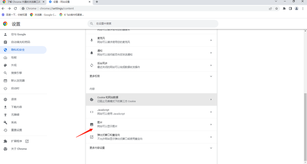 1、在谷歌浏览器的隐私和安全界面中,点击【图片】。