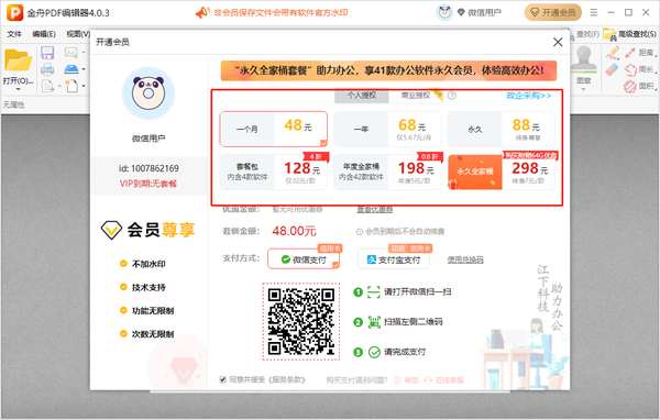 4、接着,选择需要购买的套餐,支付宝或者微信扫码支付后即可成为软件VIP会员,成为VIP后使用将不受任何限制,享受会员尊享特权!