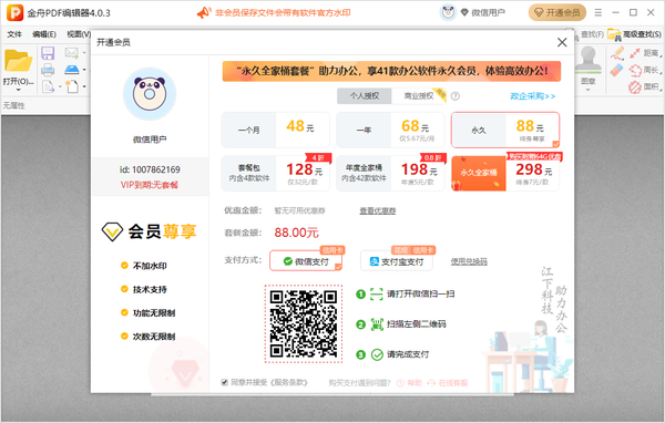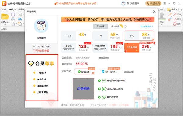 我们在使用金舟PDF编辑器处理PDF文件时,在导出文件的时候会发现文件是有官方水印的,很多朋友并不想要水印,金舟PDF编辑器非会员保存文件就是会自动官方水印的,开通VIP都就不会带官方水印啦,金舟PDF编辑器会员多少钱呢,除了可以不带官方水印还有什么其他权益呢,接下来小编就给大家介绍一下金舟PDF编辑器会员价格和权益吧。