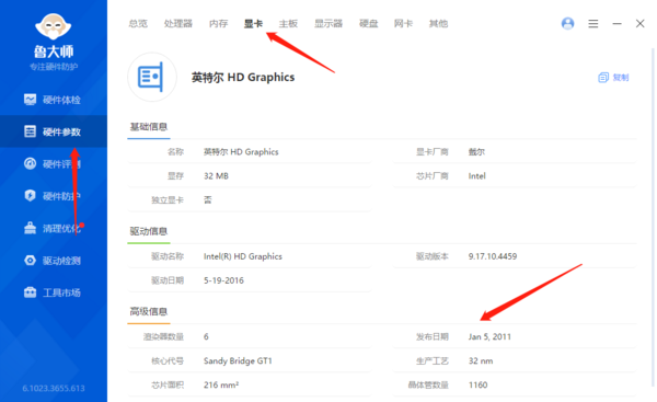 点击硬件参数的【处理器】、【显卡】、【主板】分栏,可以看到这些设备的发布日期;