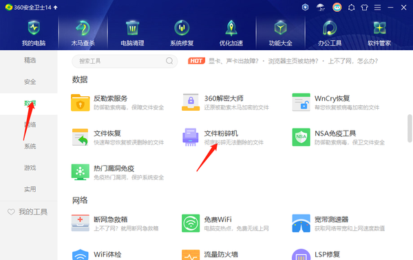 2、进入到360安全卫士的功能大全界面当中后,点击界面左侧的【数据】选项。在右侧的界面中找到【文件粉碎机】功能,并点击进行添加。