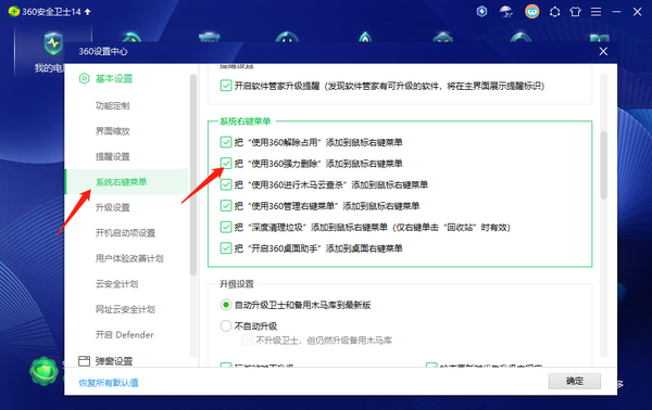 1、首先进入360安全卫士设置界面,在左侧选择【系统右键菜单】,然后勾选【把360强力删除添加到鼠标右键菜单】。