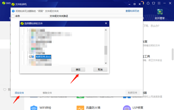 3、文件粉碎机功能添加成功后,电脑上就会弹出文件粉碎机的窗口,点击界面左下角的【添加文件】按钮,然后将需要进行粉碎的文件进行选中,然后点击【确定】按钮。