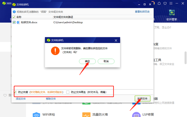 4、想要粉碎的文件选中好以后,可以选择是否防止回复和防止文件再生,然后点击【粉碎文件】。此时系统会弹出【文件将彻底删除,确定要粉碎选定的文件(文件夹)吗】,点击【确定】即可将文件进行粉碎删除了。