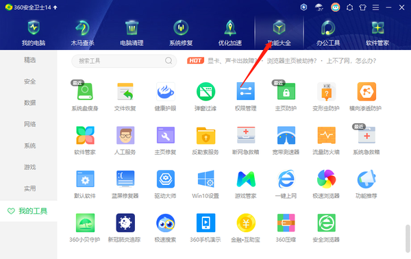 1、打开电脑上的360安全卫士,然后点击界面上方的【功能大全】选项。