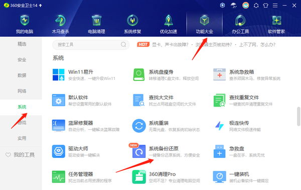 1、打开360安全卫士,点击上方的【功能大全】,进入后再左侧点击【系统】,在系统工具中找到【系统备份还原】功能并点击,然后等待添加。
