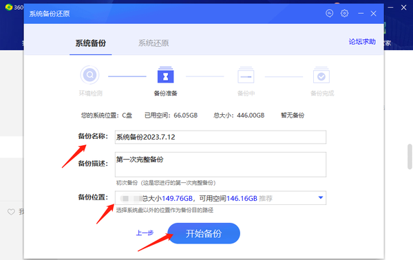 4、填写【备份名称】,选择【备份位置】,点击【开始备份】即可。