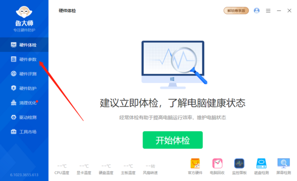 1、首先,打开鲁大师,点击如图所示左侧分栏的【硬件参数】;