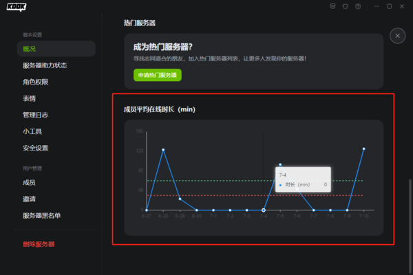 依然是在服务器设置的【概况】中,在右侧将列表下拉至最底部即可看到服务器成员平均在线时长了。