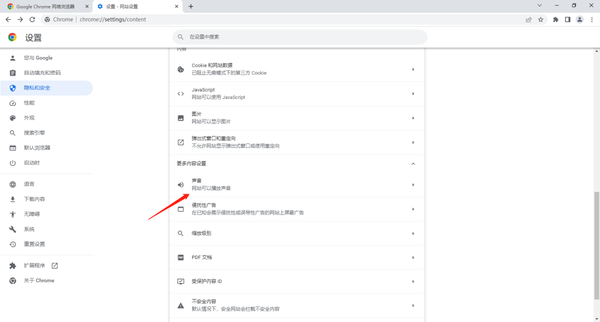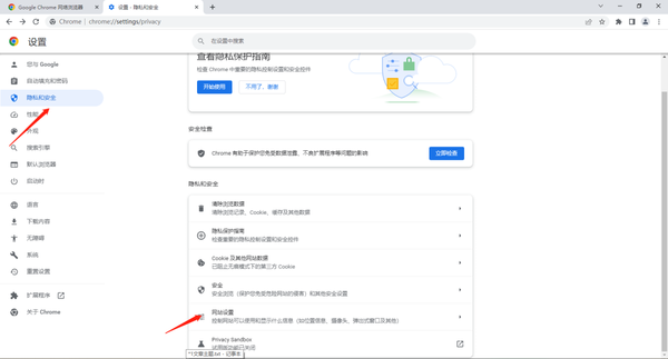 2、在设置界面打开【隐私和安全】,点击【网站设置】。