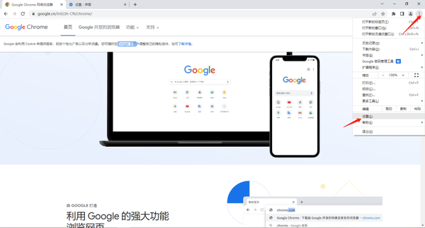 1、打开谷歌浏览器,点击右上角的【自定义及控制】,选择【设置】进入。