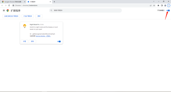 4、点击浏览器右上角【自定义及控制】-【扩展程序】-【管理扩展程序】。这时会进入谷歌浏览器的扩展程序页面,在页面右上方点击【开发者模式】开启开发者模式。