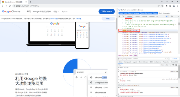 2、然后在【Elements】中再次查看网页源码编码方式,看是否同步,不同步的话就会导致网页乱码,需修改浏览器编码。