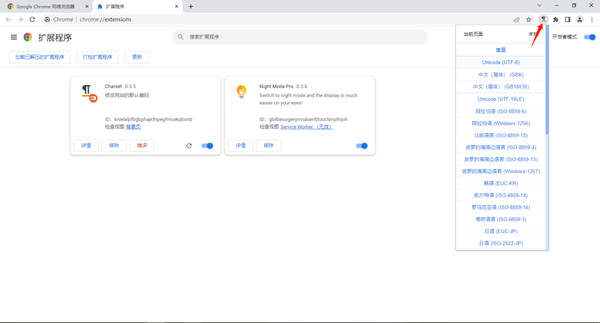 谷歌浏览器是不支持编码修改功能的,所以我们需要给谷歌浏览器安装一款名为Charset的扩展程序,安装后才可以修改编码方式。