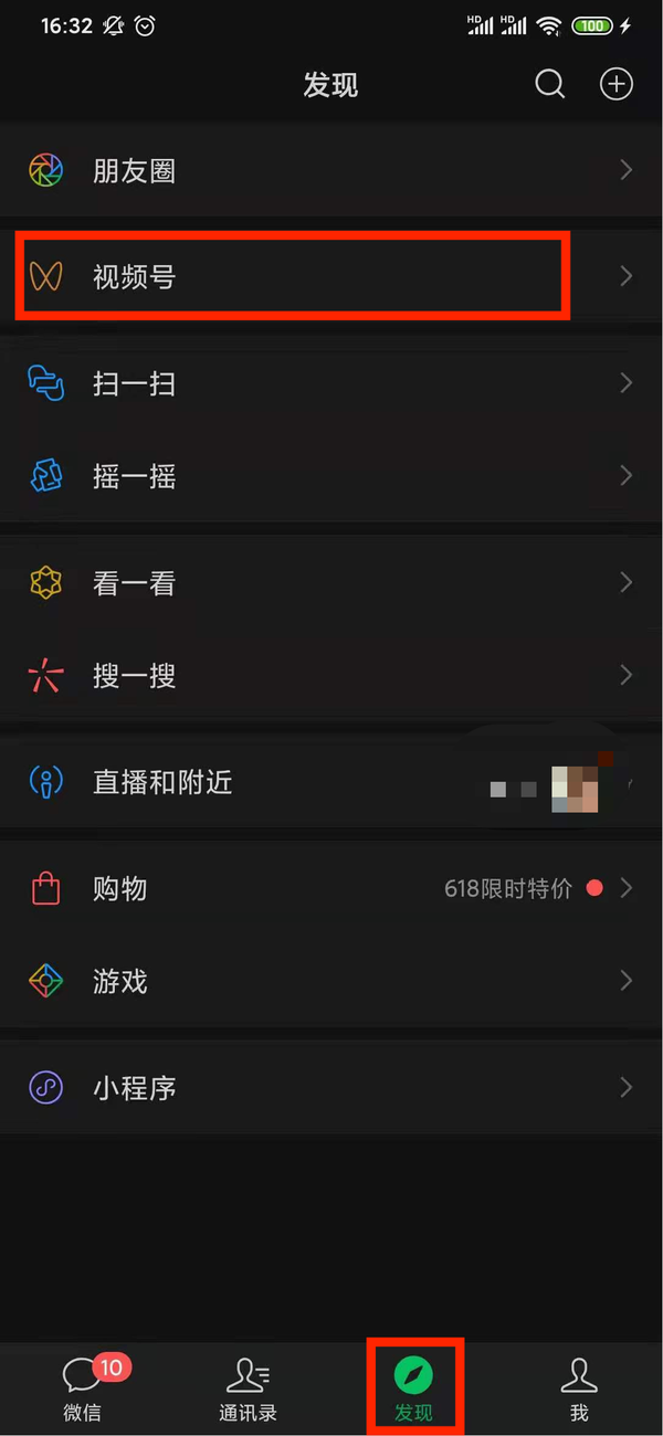 第二步,在发现页上方,朋友圈入口下面便是视频号入口,点击进入视频号;