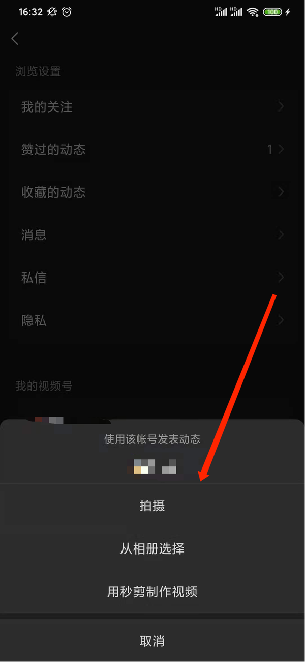 第四步,在该页面下方便有【发表视频】,点击【发表视频】可以选择“拍摄”、“从相册选择”或者“用秒剪制作视频”;