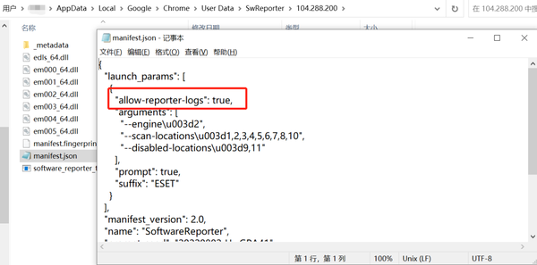 3、找到安装目录下的【manifest.json】文件,将【allow-reporter-logs: true】 修改为 【allow-reporter-logs:false】。