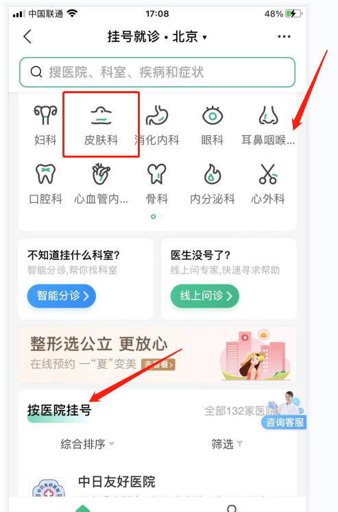 第四步:进入到挂号就诊的界面后,会看到按照科室挂号或是选择医院挂号两种类型,我就以科室挂号为例,点击其图标。