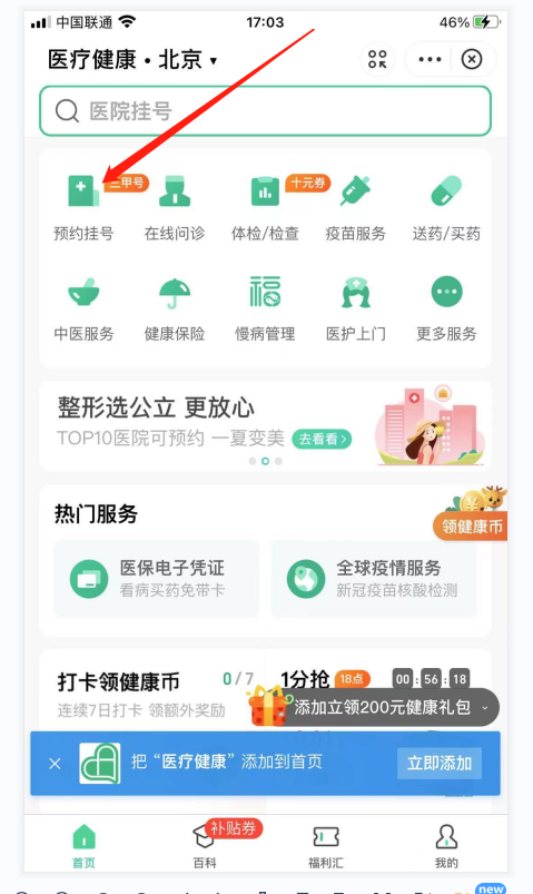 第三步:进入到医疗健康的界面后,在左下角会看到预约挂号,然后点击它。