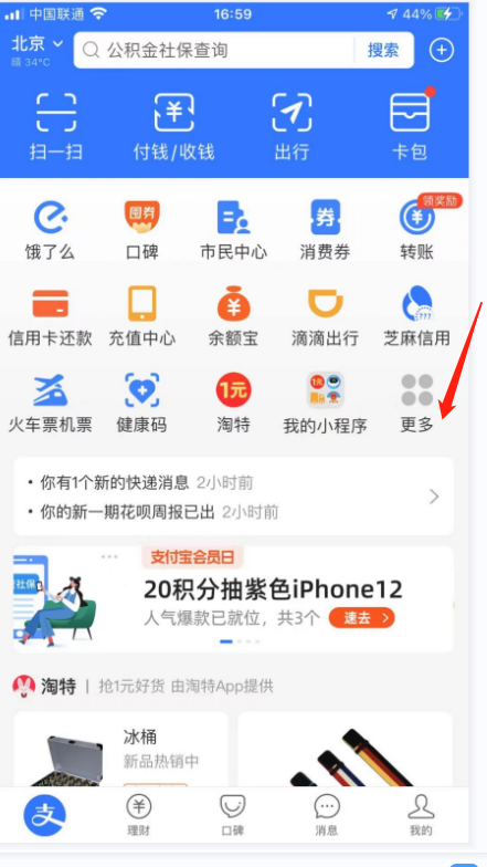 首先第一步打开支付宝进入到主页面后,点击更多。