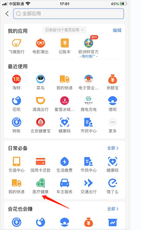 第二步:进入到我的应用后,在日常必备中找到医疗健康,点击它。