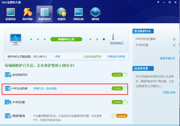 在360安全卫士中开启ARP防火墙功能,该功能主要是抵御ARP病毒的,ARP病毒是通过局域网进行攻击的,而ARP防火墙可以及时查杀截获ARP病毒发送的数据包,保证网络的畅通以及通讯的安全。