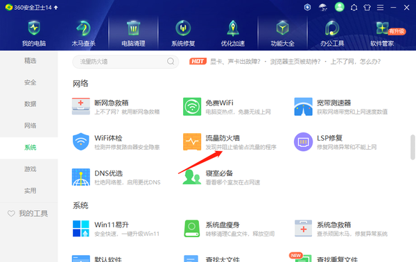 1、启动电脑上的360安全卫士,然后点击界面顶部的【功能大全】,接着在界面中找到【流量防火墙】功能。