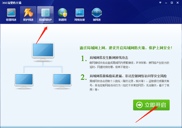 2、接着软件就会弹出【360流量防火墙】的窗口界面了,点击界面顶部的【局域网防护】功能,然后点击【立即开启】按钮。