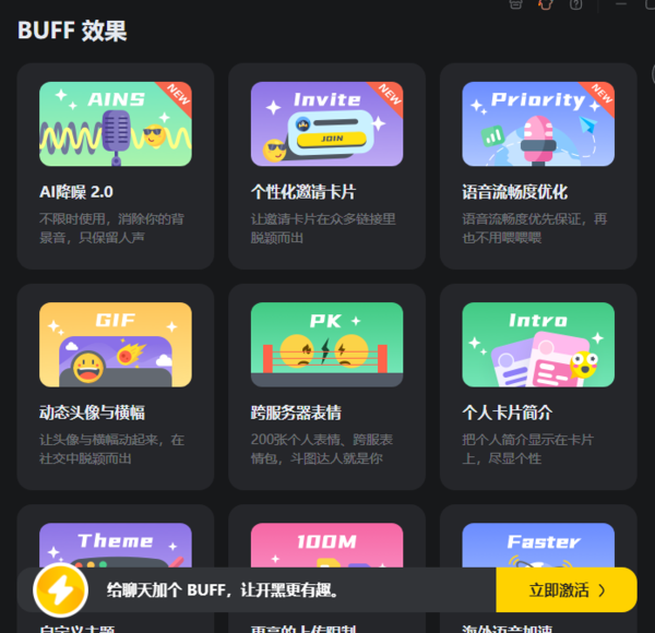BUFF是KOOK的增值产品之一,也就是会员体系,体现在我们的个人账户上,激活BUFF的权益也比较集中在个人权益中。激活BUFF来获得使用动态头像、自定义编号、跨服务器使用标签、上传文件解除限制等会员特权。