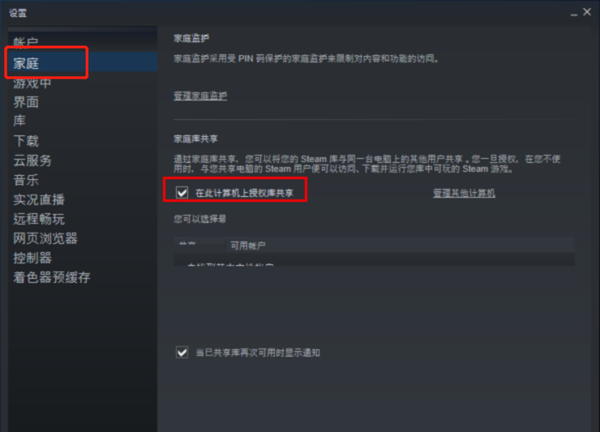 四、因为小编没有在steam上注册游戏账号,所以这里没有显示可以共享的账户,选择好想要共享给好友的账号,还需要将“当已共享库再次可用时显示通知”勾选上,这样当你在进行游戏的时候,如果对方就不能成功登录你的账号,可以防止你被好友顶下去。