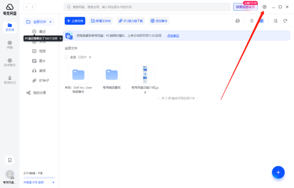 1、打开下载好的夸克网盘,并登陆自己的账号,在网盘主界面右上角点击【齿轮】按钮;